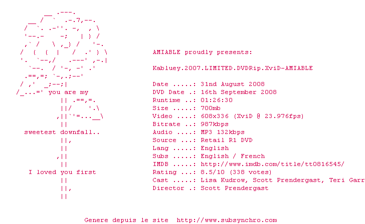 Voir le nfo de la release Kabluey.2007.LIMITED.DVDRip.XviD-AMIABLE