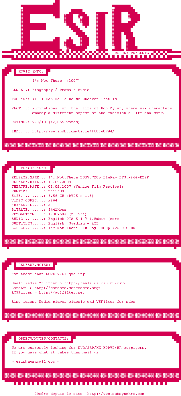 Voir le nfo de la release Im.Not.There.2007.720p.BluRay.DTS.x264-ESiR