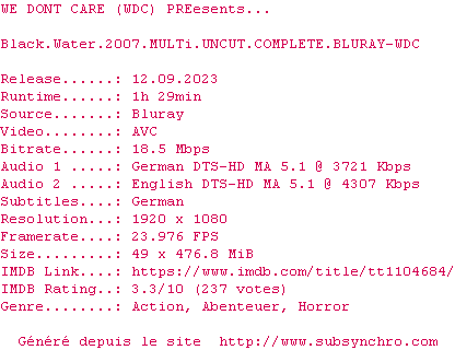 Voir le nfo de la release Blackwater.2007.MULTi.UNCUT.COMPLETE.BLURAY-WDC