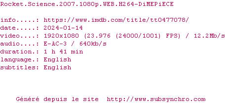 | Voir le nfo de la release Rocket.Science.2007.1080p.WEB.H264-DiMEPiECE | DiMEPiECE | Rocket.Science.2007.1080p.WEB.H264-DiMEPiECE OpenSubtitles | 0 fichier | ||