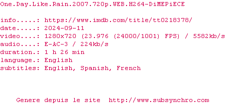 | DiMEPiECE | One.Day.Like.Rain.2007.1080p.WEB.H264-DiMEPiECE OpenSubtitles | 0 fichier |