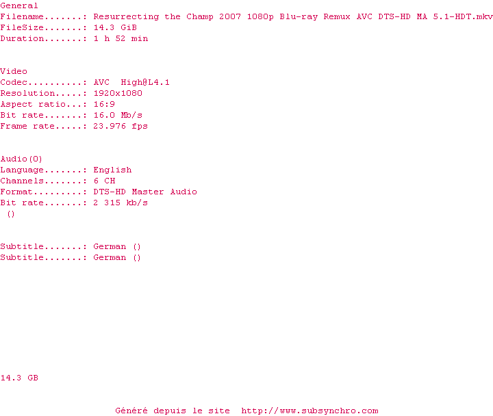 Voir le nfo de la release Resurrecting.The.Champ.2007.1080p.Blu-ray.Remux.AVC.DTS-HD.MA.5.1-HDT