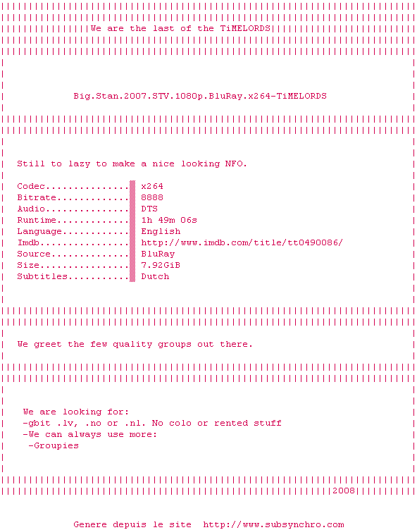 | Voir le nfo de la release Big.Stan.2007.STV.1080p.BluRay.x264-TiMELORDS | TiMELORDS | Big.Stan.2007.STV.1080p.BluRay.x264-TiMELORDS OpenSubtitles | 0 fichier |