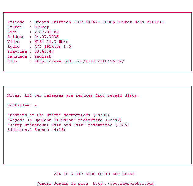 Voir le nfo de la release Oceans.Thirteen.2007.EXTRAS.1080p.BluRay.H264-RMXTRAS