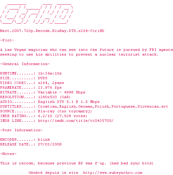 Voir le nfo de la release Next.2007.720p.Recode.BluRay.DTS.x264-CtrlHD