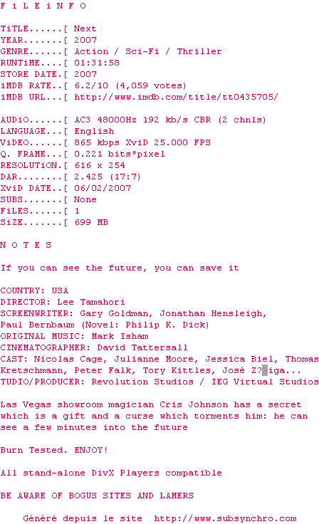 Voir le nfo de la release Next.2007.DvDrip.AC3.Eng-aXXo