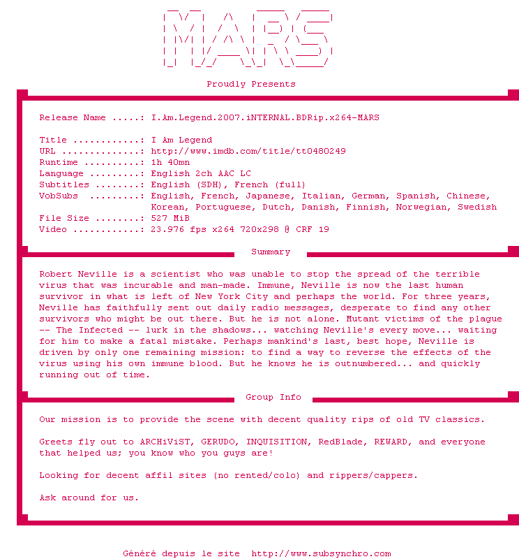 Mais Neville n'est pas seul. Des mutants, victimes de cette peste moderne - on les appelle les "Infectés" - rôdent dans les ténèbres... observent ses moindres gestes, guettent sa première erreur. Devenu l'ultime espoir de l'humanité, Neville se consacre tout entier à sa mission : venir à bout du virus, en annuler les terribles effets en se servant de son propre sang.Ses innombrables ennemis lui en laisseront-ils le temps ? Le compte à rebours touche à sa fin...