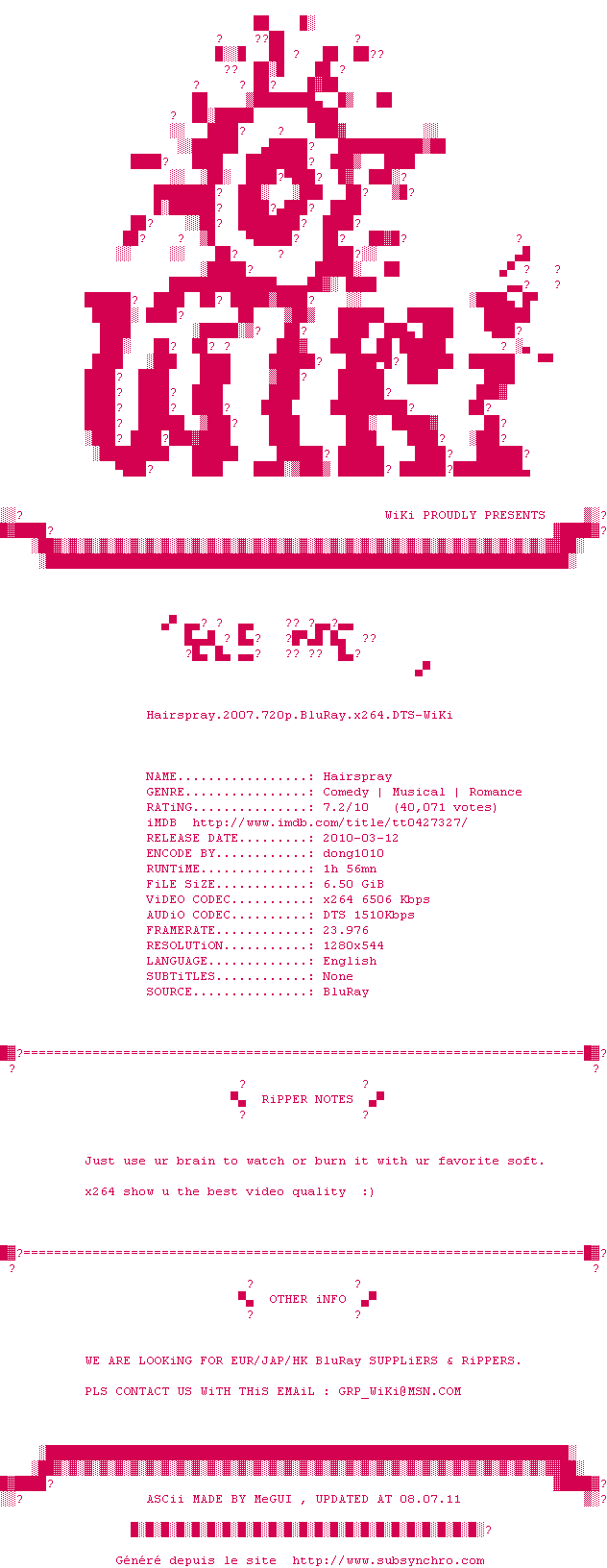 Voir le nfo de la release Hairspray.2007.720p.BluRay.x264.DTS-WiKi