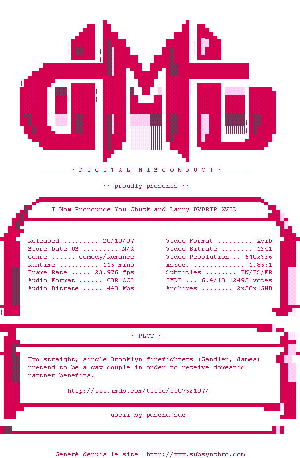 Voir le nfo de la release I.Now.Pronounce.You.Chuck.And.Larry.2007.DvDrip-aXXo