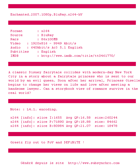 Voir le nfo de la release Enchanted.2007.1080p.BluRay.x264-hV