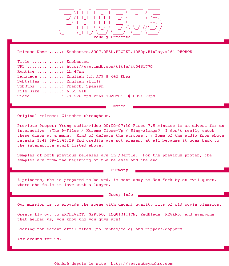 Voir le nfo de la release Enchanted.2007.REAL.PROPER.1080p.BluRay.x264-PHOBOS