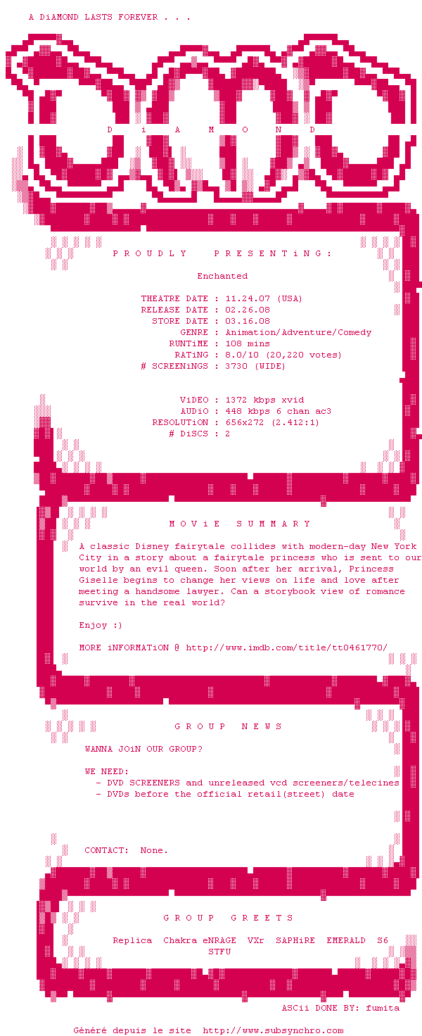 Voir le nfo de la release Enchanted.DVDRip.XviD-DiAMOND