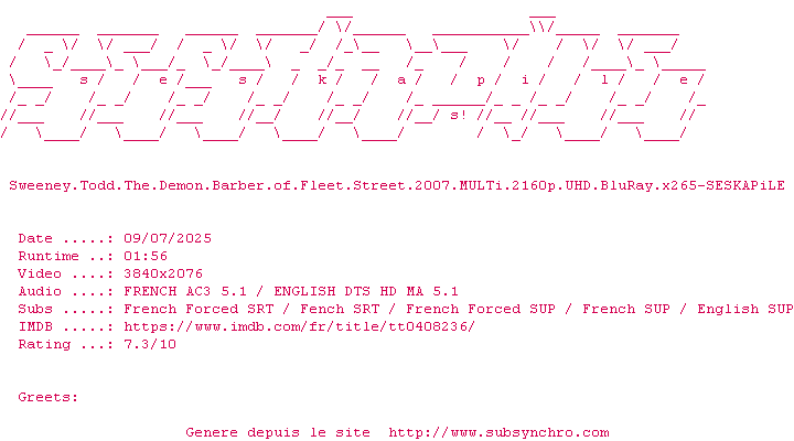 Voir le nfo de la release Sweeney.Todd.The.Demon.Barber.Of.Fleet.Street.2007.MULTi.2160p.UHD.BluRay.x265-SESKAPiLE