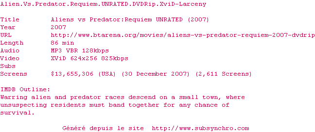 | Voir le nfo de la release Aliens.vs.Predator.Requiem.UNRATED.DVDRip.XviD-larceny | larceny | Aliens.vs.Predator.Requiem.UNRATED.DVDRip.XviD-larceny OpenSubtitles | 10/12/2009 | 1 fichier | |