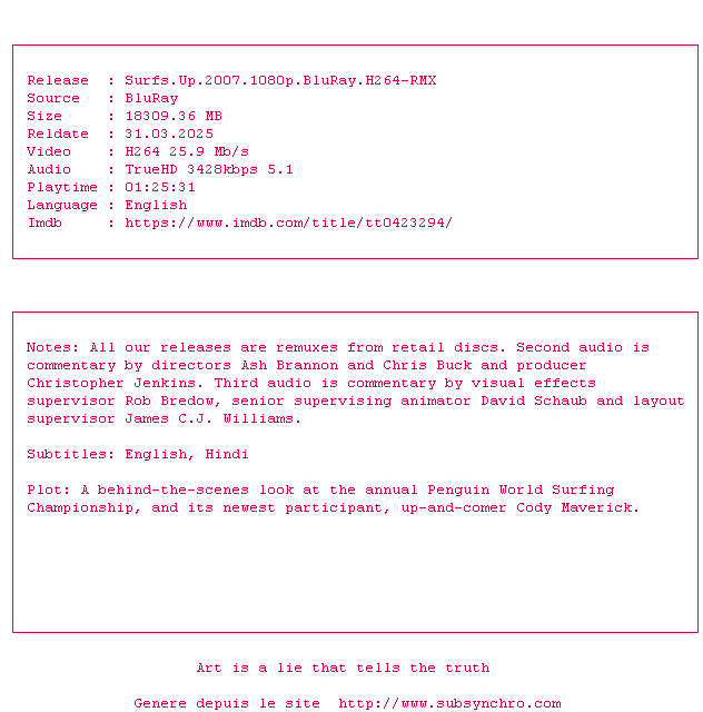 | Voir le nfo de la release Surfs.Up.2007.1080p.BluRay.x264-HD1080 | HD1080 | Surfs.Up.2007.1080p.BluRay.x264-HD1080 OpenSubtitles | 0 fichier | ||