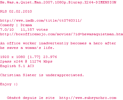 Voir le nfo de la release He.Was.a.Quiet.Man.2007.720p.Bluray.X264-DIMENSION