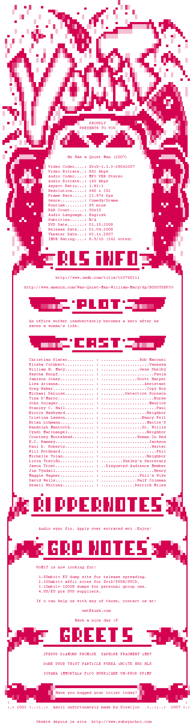 Voir le nfo de la release He.Was.A.Quiet.Man.2007.DVDRip.XviD-VoMiT
