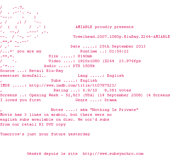 | Voir le nfo de la release Towelhead.2007.1080p.BluRay.X264-AMIABLE | AMIABLE | Towelhead.2007.1080p.BluRay.X264-AMIABLE OpenSubtitles | 0 fichier | ||