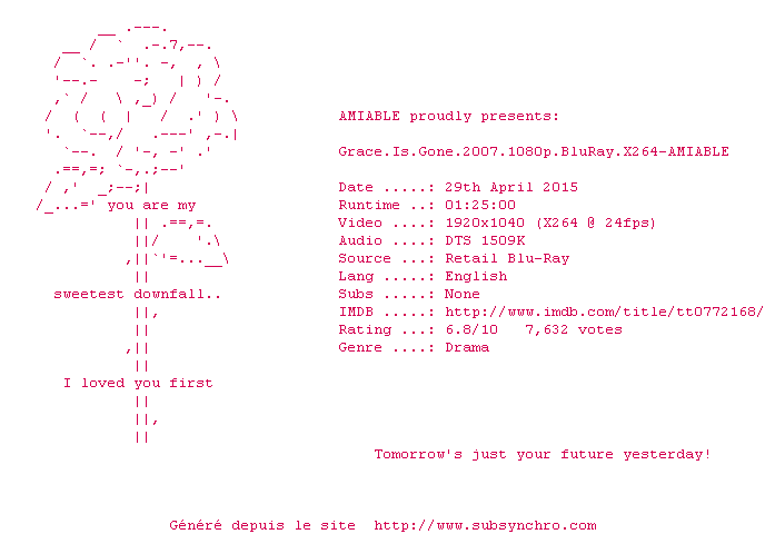 | Voir le nfo de la release Grace.Is.Gone.2007.1080p.BluRay.X264-AMIABLE | AMIABLE | Grace.Is.Gone.2007.1080p.BluRay.X264-AMIABLE OpenSubtitles | 0 fichier | ||
