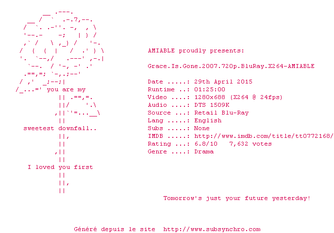 | Voir le nfo de la release Grace.Is.Gone.2007.720p.BluRay.X264-AMIABLE | AMIABLE | Grace.Is.Gone.2007.720p.BluRay.X264-AMIABLE OpenSubtitles | 0 fichier | ||