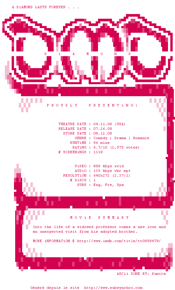 | Voir le nfo de la release Smart.People.DVDRip.XviD-DiAMOND | DiAMOND | Smart.People.DVDRip.XviD-DiAMOND OpenSubtitles | 0 fichier | ||