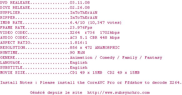 Bee.Movie.2007.DVDRip.X264.AC3.iNT-TLF.zip Ajouté par Ultimhate Ajoute le 21-07-2010 02:57:29 Format : ZIP Italique : Non Taille : 0.00Ko Telechargement : 31 Le fichier 138-1279673872.zip n'existe pas ! Ajouter cette release à ma collection en cas de telechargement des sous-titres 0 0 0 Telecharger le ZiP contenant NFO, Affiche, Sous-titre (*.zip) Commentez le fichier Bee.Movie.2007.DVDRip.X264.AC3.iNT-TLF.zip Commentez le fichier Bee.Movie.2007.DVDRip.X264.AC3.iNT-TLF.zip Commentez ce fichier Le fichier 138-1279673872.zip n'existe pas ! Telechargez le RSS « Fichier de la release Bee.Movie.2007.DVDRip.X264.AC3.iNT-TLF » Retour au film « Bee Movie : Drôle d'abeille »
