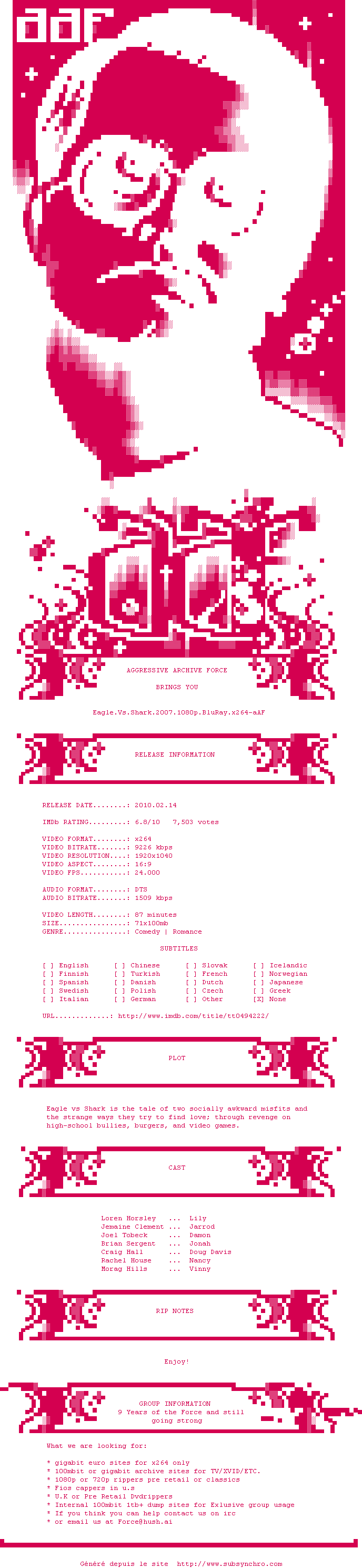 Telechargez le RSS « Fichier de la release Eagle.Vs.Shark.2007.1080p.BluRay.x264-aAF »