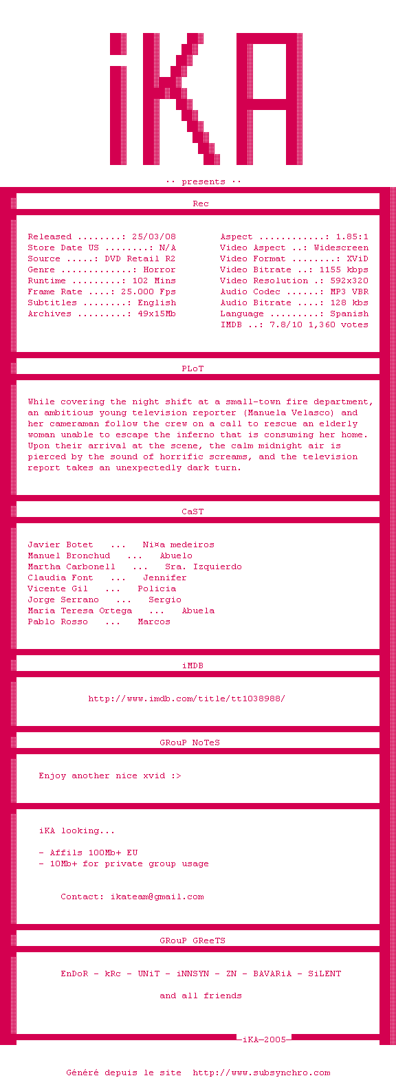 Telechargez le RSS « Fichier de la release Rec.2007.DVDRiP.XViD-iKA »