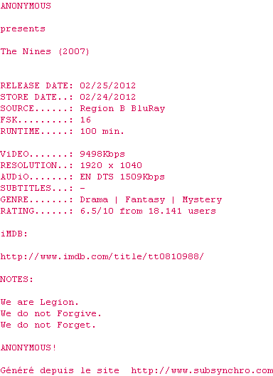 Telechargez le RSS « Fichier de la release The.Nines.2007.LiMiTED.1080p.BluRay.DTS.x264-AN0NYM0US »