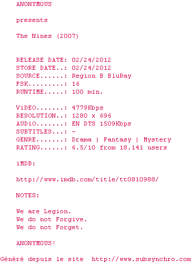 Telechargez le RSS « Fichier de la release The.Nines.2007.LiMiTED.720p.BluRay.x264-AN0NYM0US »