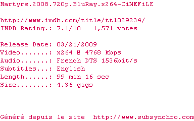 Voir le nfo de la release Martyrs.2008.1080P.BLURAY.H264-UNDERTAKERS