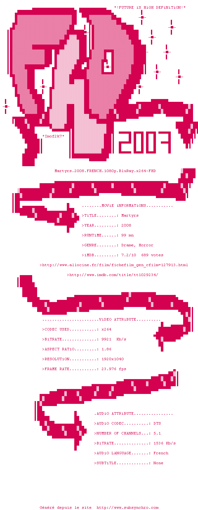 Voir le nfo de la release Martyrs.2008.FRENCH.1080p.BluRay.x264-FHD