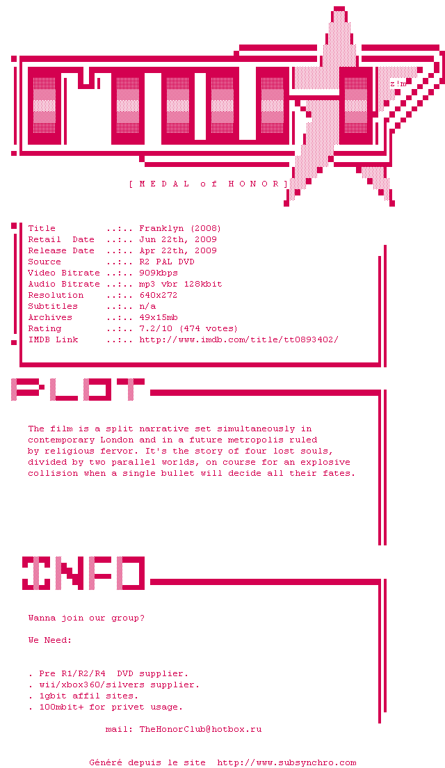 Voir le nfo de la release Franklyn.2008.Blu-ray.720p.DTS.x264-CHD