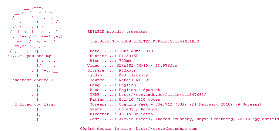 | Voir le nfo de la release The.Good.Guy.2009.LIMITED.DVDRip.XviD-AMIABLE | AMIABLE | The.Good.Guy.2009.LIMITED.DVDRip.XviD-AMIABLE OpenSubtitles | 0 fichier | ||