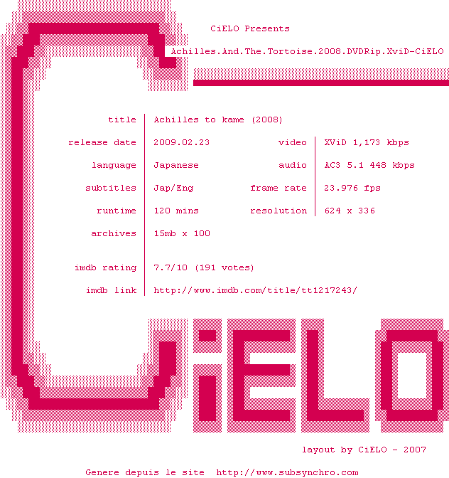 Voir le nfo de la release Achilles.And.The.Tortoise.2008.DVDRip.XviD-CiELO