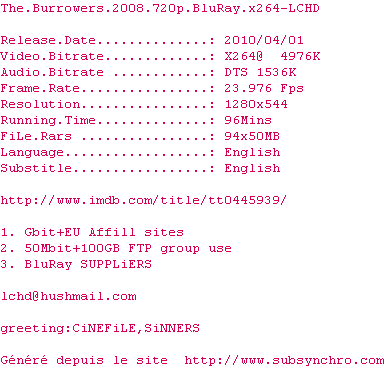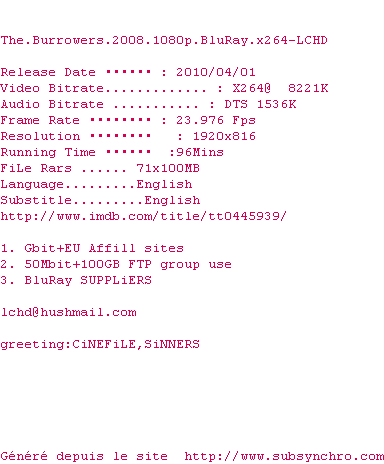 Voir le nfo de la release The.Burrowers.2008.720p.BluRay.x264-LCHD