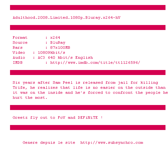 Voir le nfo de la release Adulthood.2008.Limited.1080p.Bluray.x264-hV