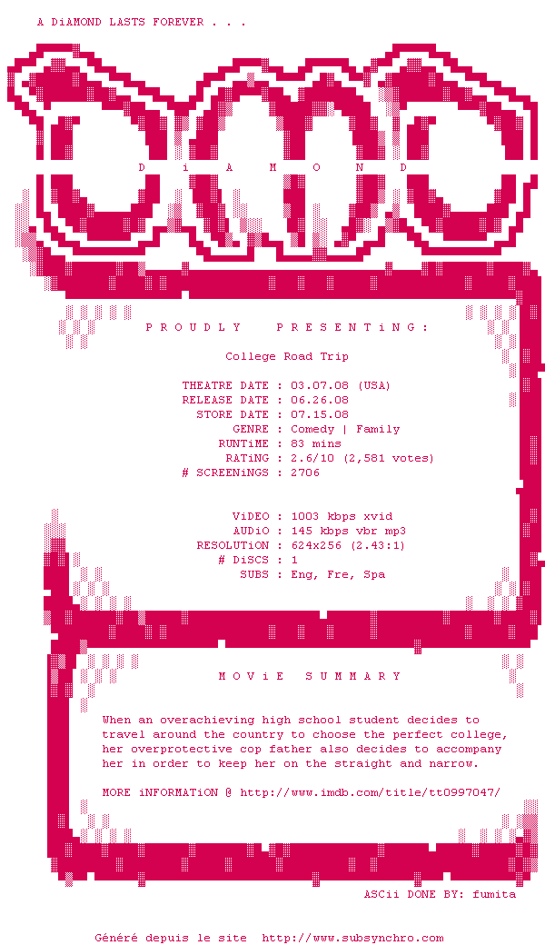 Voir le nfo de la release College.Road.Trip.DVDRip.XviD-DiAMOND