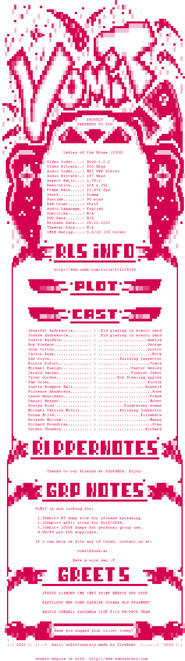 | Voir le nfo de la release Ladies.Of.The.House.2008.DVDRip.XviD-VoMiT | VoMiT | Ladies.Of.The.House.2008.DVDRip.XviD-VoMiT OpenSubtitles | 0 fichier |