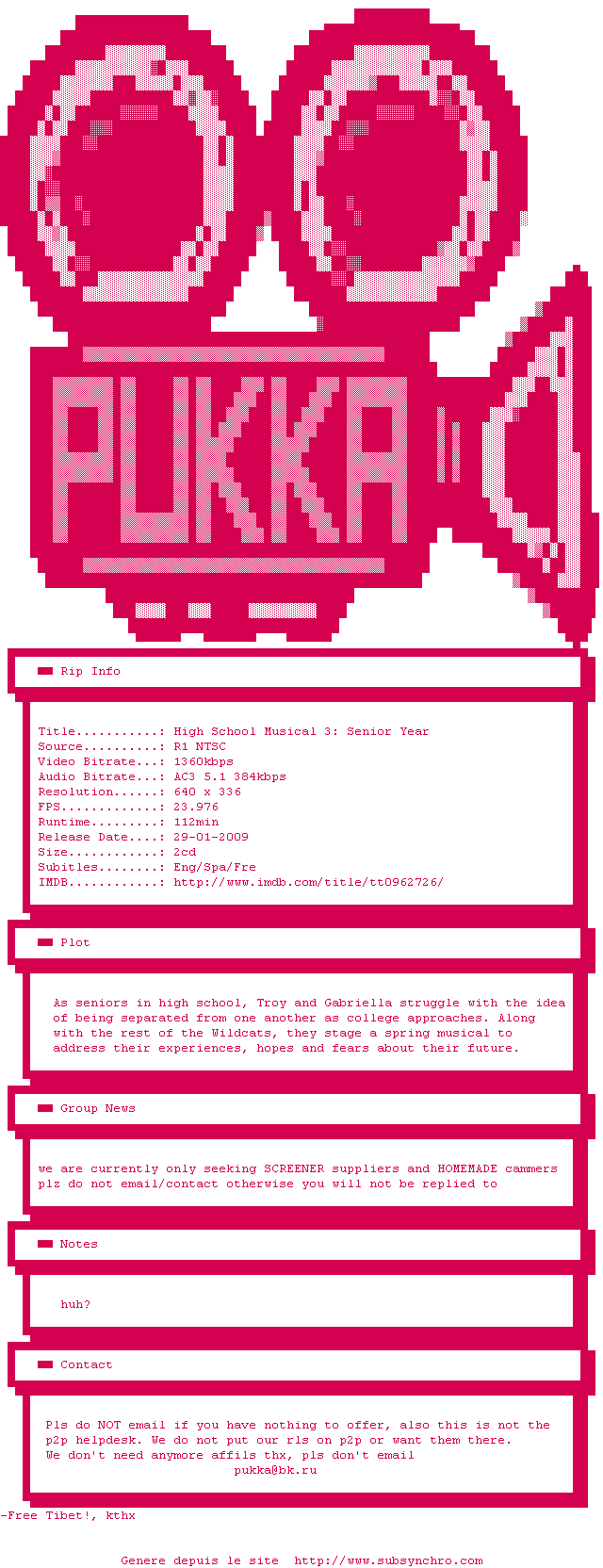 Voir le nfo de la release High.School.Musical.3.DVDRip.XViD-PUKKA