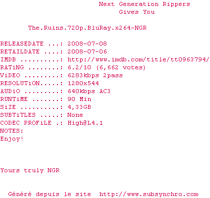 Voir le nfo de la release The.Ruins.720p.BluRay.x264-NGR