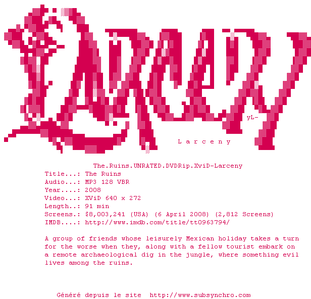 Voir le nfo de la release The.Ruins.UNRATED.DVDRip.XviD-Larceny