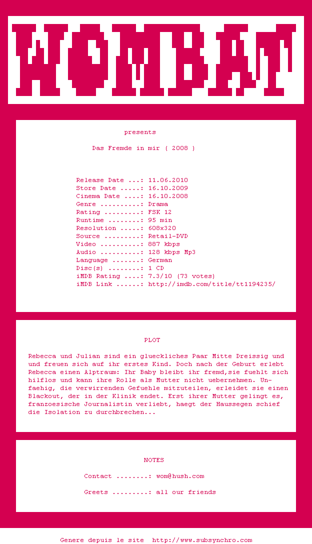 Y avez-vous pense ? Nous proposons déjà 1723 sous-titres pour le film L'Étranger en moi. Avez-vous essaye de voir si ces sous-titres etaient compatibles avec cette release ? On vous laisse le soin de tester cela pour nous et de contribuer au site en postant le sous-titre en cas de compatiblite constatee !