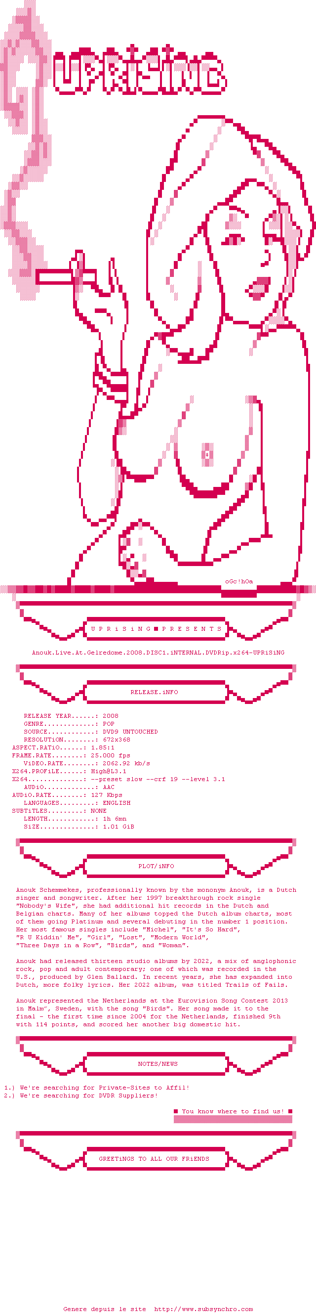 Voir le nfo de la release Anouk.Live.At.Gelredome.2008.DISC1.iNTERNAL.DVDRip.x264-UPRiSiNG