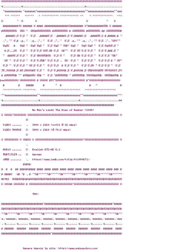 Voir le nfo de la release No.Mans.Land.The.Rise.Of.Reeker.2008.2160p.UHD.BluRay.x265-SURCODE