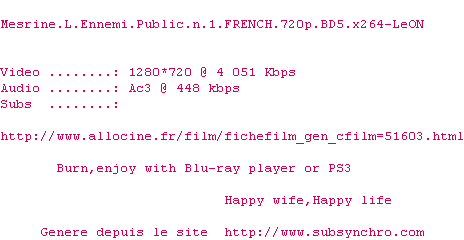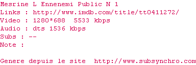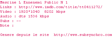 Voir le nfo de la release Mesrine.L.Ennemi.Public.N.1.FRENCH.720p.BD5.x264-LeON