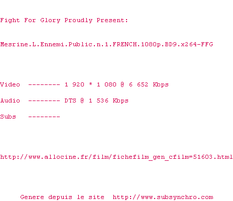 Voir le nfo de la release Mesrine.L.Ennemi.Public.N.1.FRENCH.1080p.BD9.x264-FFG