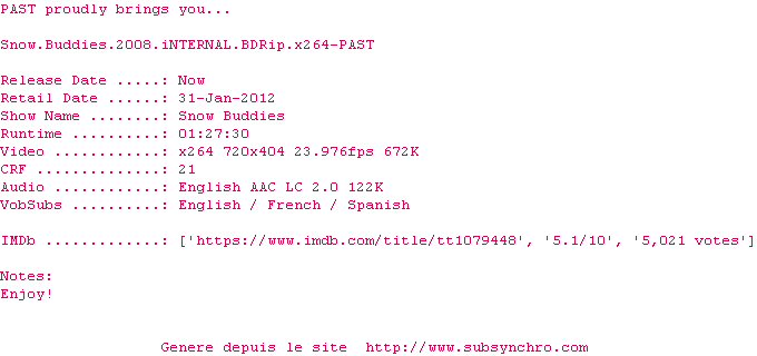 Voir le nfo de la release Snow.Buddies.2008.iNTERNAL.BDRip.x264-PAST