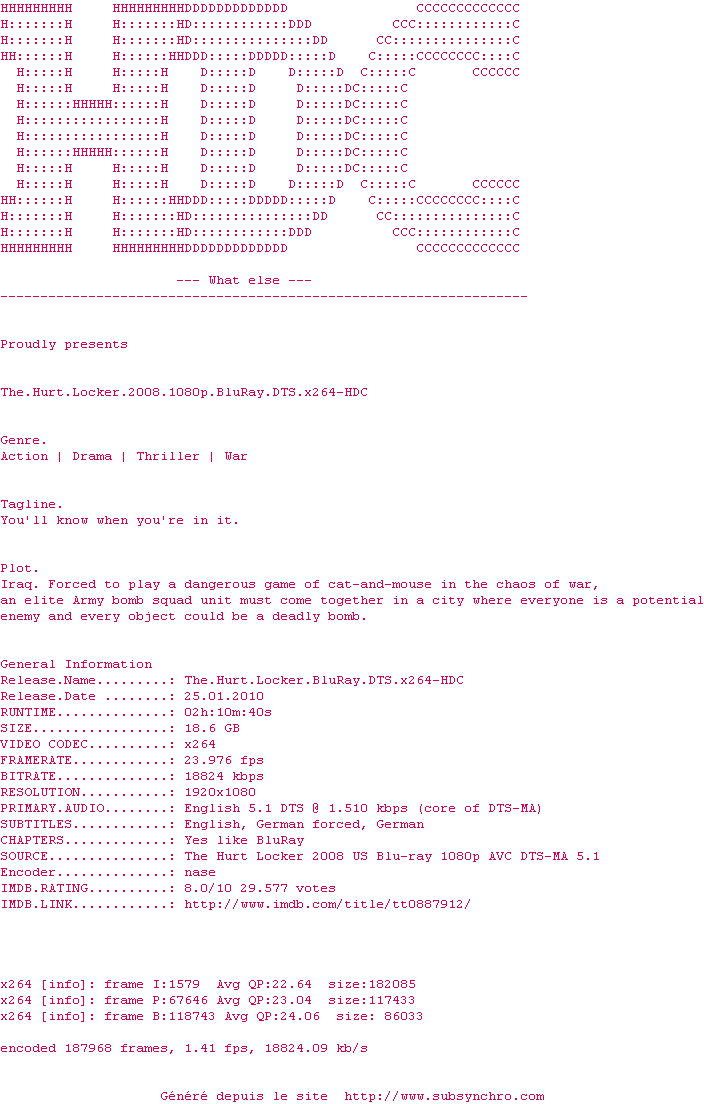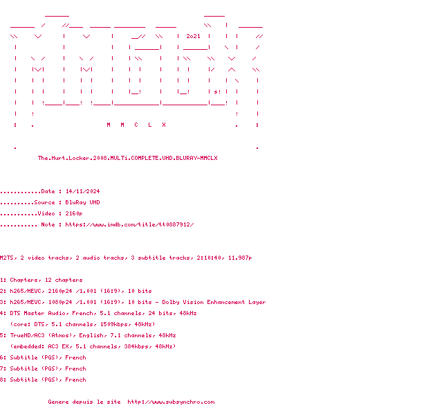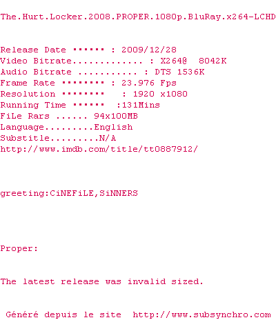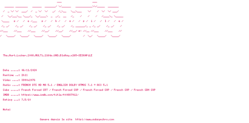 Le commentaire de Yaumegui Commente par Yaumegui (603), Le Lundi 09 Decembre 2013 à 14h24 Un énorme film de guerre filmé par une spécialiste du genre Kathryn Bigelow (K-19 : Le Piège des profondeurs et Zero Dark Thirty. Tout au long du film le spectateur vit au plus près la tension du soldat, en plus la fin est assez bouleversante. 9 / 10 2 0