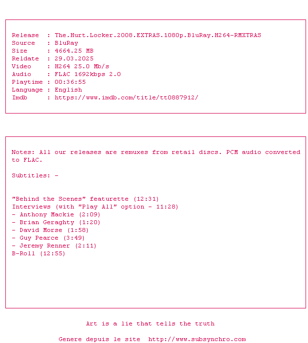 Un énorme film de guerre filmé par une spécialiste du genre Kathryn Bigelow (K-19 : Le Piège des profondeurs et Zero Dark Thirty. Tout au long du film le spectateur vit au plus près la tension du soldat, en plus la fin est assez bouleversante.